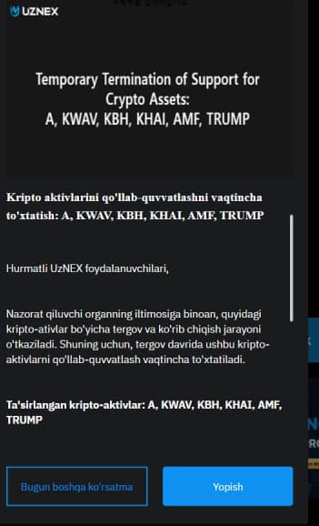 O‘zbekistondagi litsenziyaga ega kriptobirja saytida A, KWAV, KBH, KHAI, AMF hamda Amerika prezidenti Donald Tramp sharafiga yaratilgan TRUMP kriptoaktivlari tekshirilayotgani haqida ma’lumot chiqmoqda.