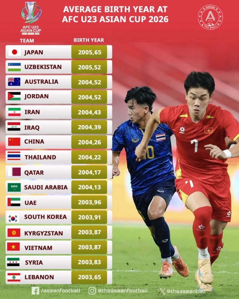 Ro‘yxatga ko‘ra Yaponiya olimpiyachilarining o‘rtacha yili 2005,65 ni tashkil etgan. O‘zbekistonlik futbolchilar esa 2005,52 ko‘rsatkich bilan ikkinchi o‘rinda. Shuningdek, keyingi pog‘onalarda Avstraliya (2004,52), Iordaniya(2004,52) va Eron (2004,43) jamoalari o‘rin olgan.