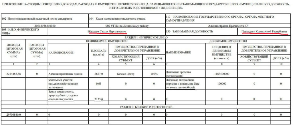 Unda qayd etilishicha, prezident Sadir Japarovning daromadi 2,2 mln somni (taxminan $25,3 ming) tashkil etgan. Xarajatlar aniq ko‘rsatilmagan.