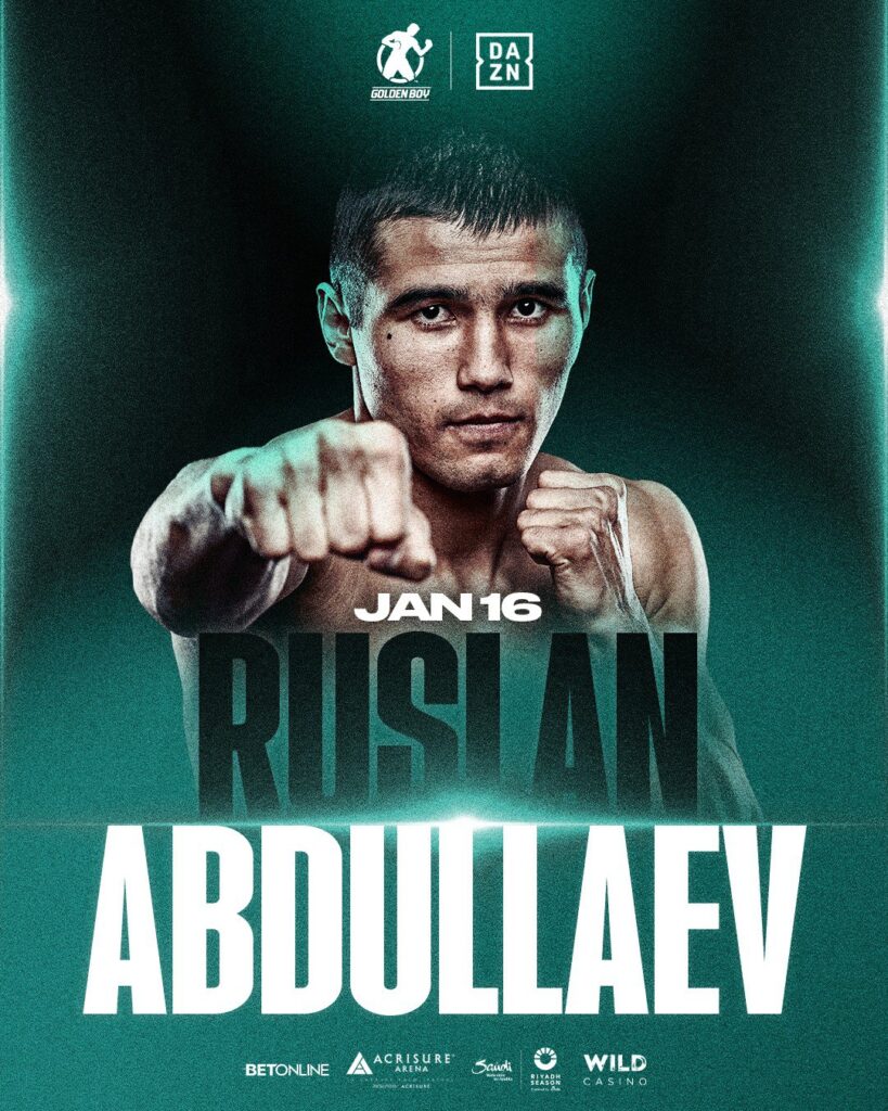 Professional boksda muvaffaqiyatli odimlayotgan o‘zbekistonlik Ruslan Abdullayev 16-yanvar kuni AQShda o‘zining navbatdagi reyting jangini o‘tkazadi. Bu haqda O‘zbekiston boks federatsiyasi xabar bermoqda.