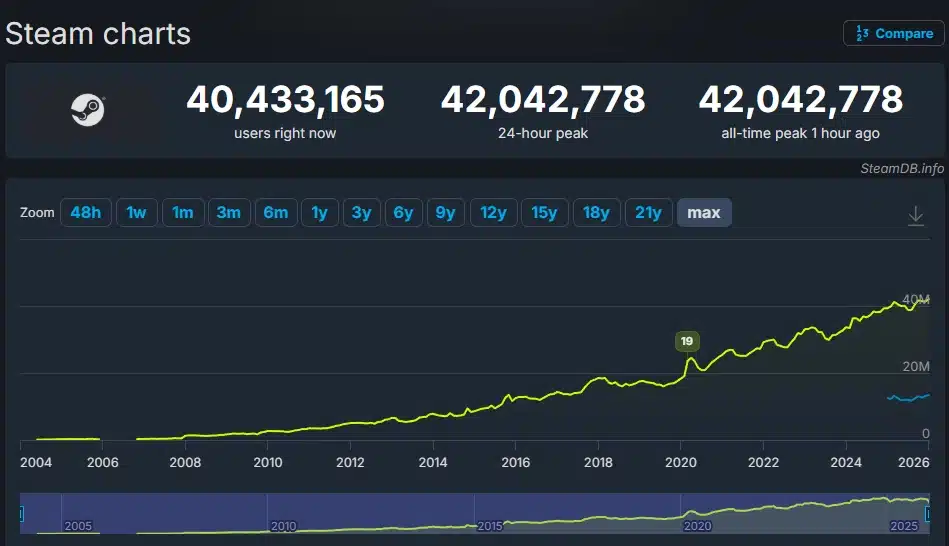 Valve kompaniyasining Steam platformasi 11-yanvar kuni foydalanuvchilar faolligi bo‘yicha yangi tarixiy rekordni qayd etdi. SteamDB ma’lumotlariga ko‘ra, bir vaqtning o‘zida tarmoqdagi foydalanuvchilar soni ilk bor 42 mlndan oshgan.
