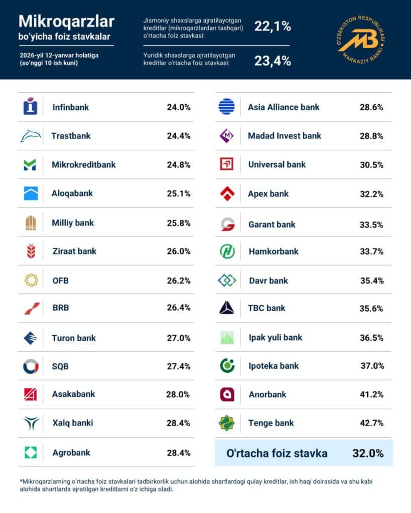 Avvalroq Kursiv Uzbekistan 6-yanvar holatiga ko‘ra, tijorat banklarida amal qilayotgan mikroqarz va avtokreditlarning so‘nggi 10 ish kuni bo‘yicha foiz stavkalari e’lon qilingani haqida yozgandi.
