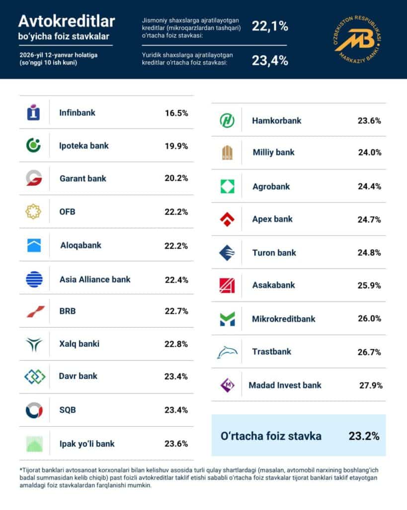 Markaziy bank izohiga ko‘ra, avtomobil ishlab chiqaruvchilar yoki dilerlar bilan hamkorlik asosida beriladigan kreditlarda foiz stavkalari pastroq bo‘lishi mumkin. Shuningdek, avtokreditlar bo‘yicha stavkalar avtomobil turi, yoshi, boshlang‘ich badal miqdori va boshqa shartlarga qarab farq qiladi.