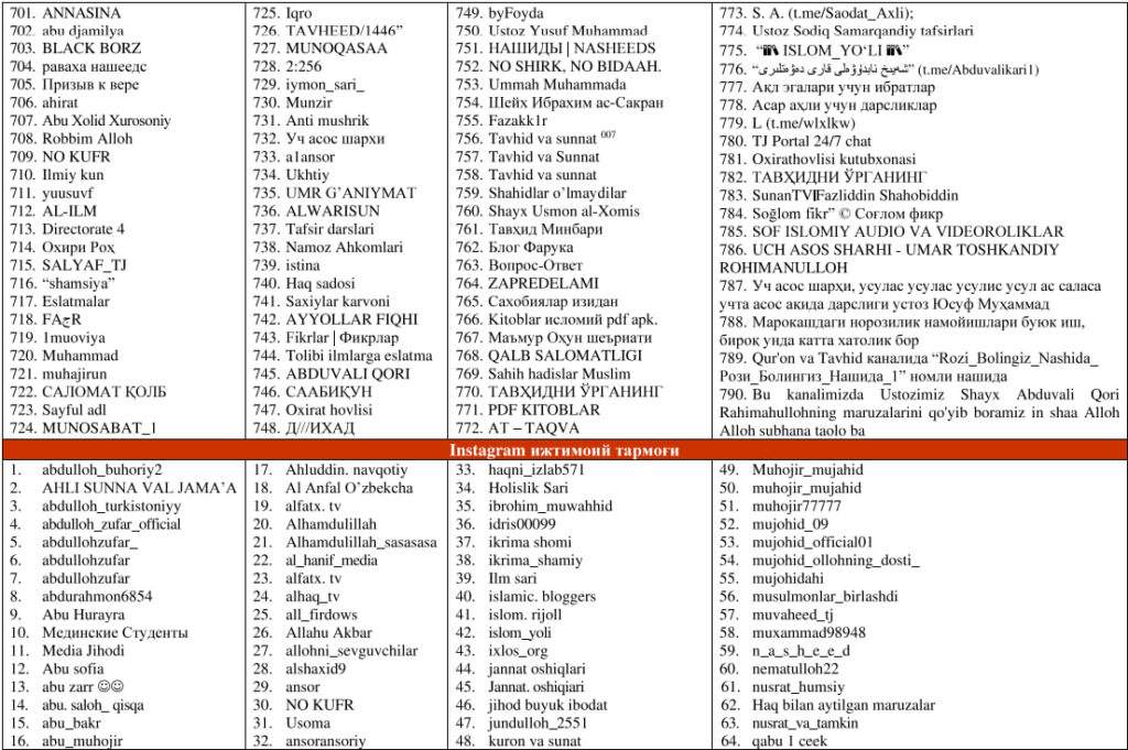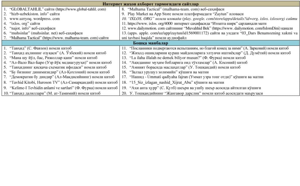 Ma’lumot uchun, ushbu taqiqlangan manbalarni tarqatish, saqlash yoki targ‘ib qilish ma’muriy yoki jinoiy javobgarlikka sabab bo‘lishi mumkin.
