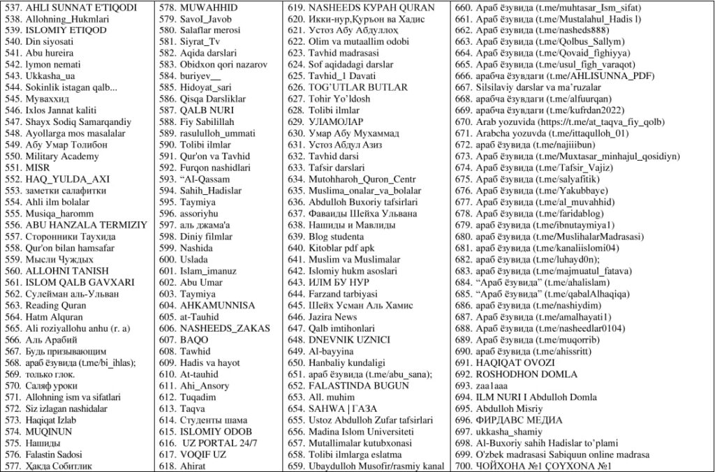 Quyida taqiqlangan manba va kontentar ro‘yxati keltirilgan: