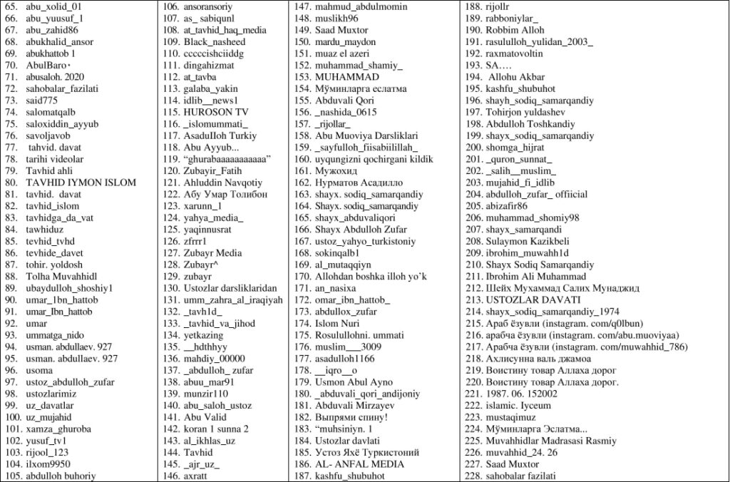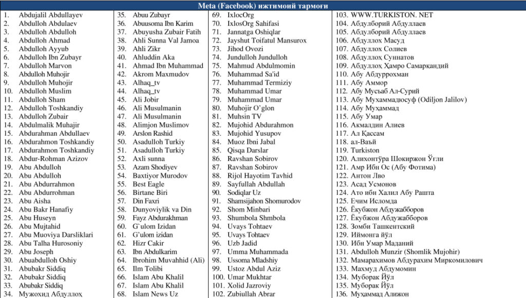 Oliy sud 2026 yil 10-yanvar holatiga ko‘ra, ekstremizm va terrorizm g‘oyalarini targ‘ib qiluvchi manba hamda kontentlar ro‘yxatini yangiladi. Jumladan, 249 ta Facebook, 790 ta Telegram, 265 ta Instagram, 167 ta YouTube, 36 ta Odnoklassniki, 53 ta TikTok kabi ijtimoiy tarmoq va videoplatformalardagi sahifalar hamda 13 ta sayt, 20 ta kitob, ma’ruza, matn va qo‘shiqlar «qora ro‘yxat»ga tushdi.