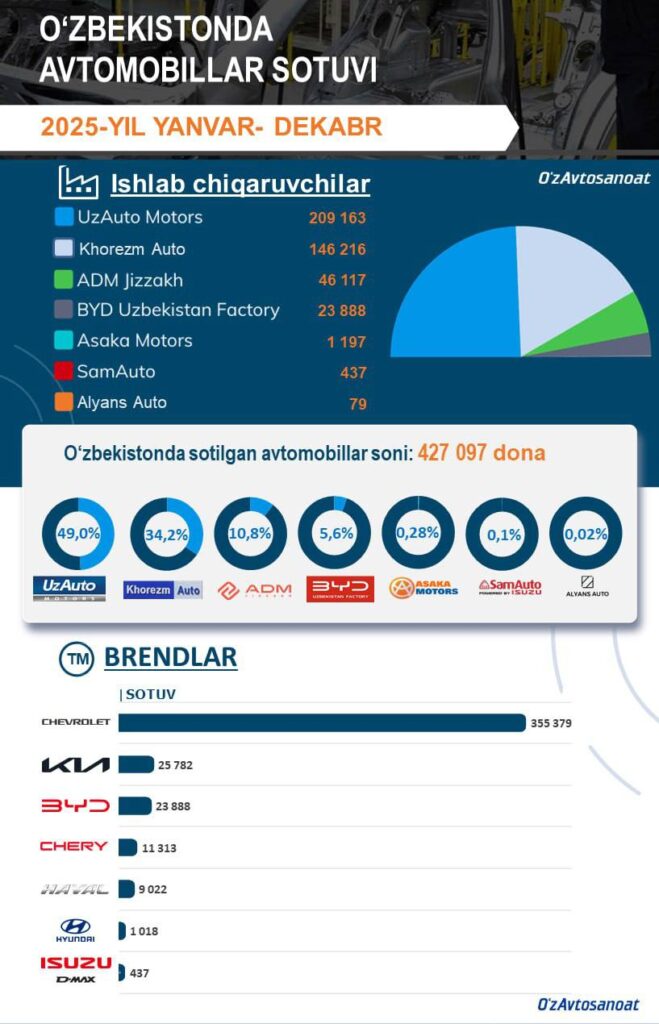 2025-yil yanvar–dekabr oylarida O‘zbekistonda 427 mingdan ortiq avtomobil sotildi. Yil yakunlariga ko‘ra, Chevrolet yetakchilikni saqlab qolgan bo‘lsa-da, sotuv hajmida pasayish qayd etildi, Kia’da esa barqaror o‘sish kuzatildi.