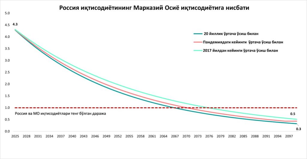 Iqtisodchining qo‘shimcha qilishicha, agar tarixiy o‘sish sur’atlari saqlanib qolsa, Markaziy Osiyo taxminan 40 yilda Rossiyadan ham iqtisodiy, ham demografik jihatdan ustun bo‘lishi mumkin.