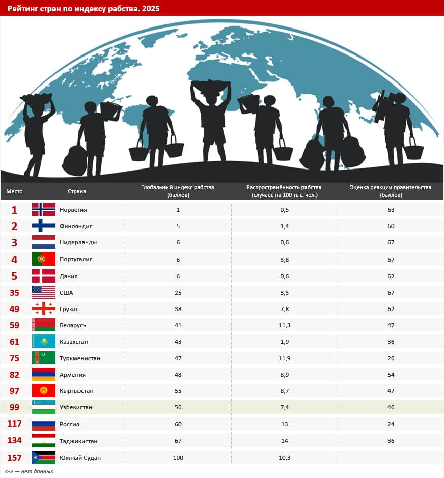 2025-yilda O‘zbekiston 157 ta davlat orasida qullik indeksi (Global Slavery Index) bo‘yicha 99-o‘rinni egalladi. Bu haqda xalqaro World Population Review media platformasi ma’lumotlarida keltirilgan.