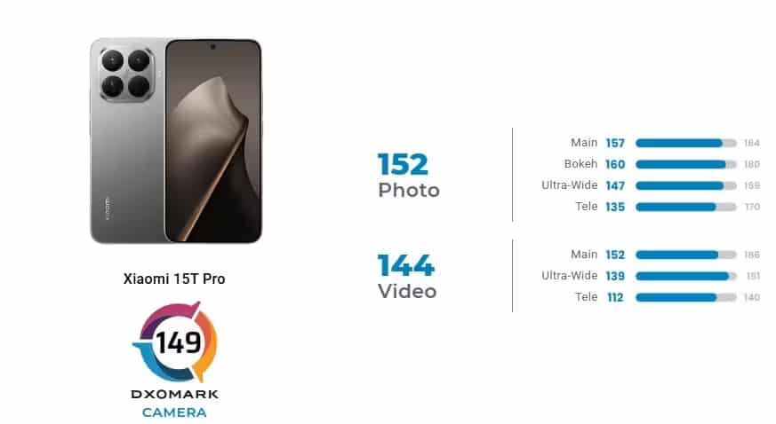 Xiaomi 15T Pro asosiy kamera sifatida 50 MP, 1/1,31 dyuymli yirik sensor bilan jihozlangan. Shuningdek, 50 MP telekamera va 12 MP keng burchakli modul mavjud. Testlarda smartfon jami 149 ball oldi. Foto uchun 152 ball, video uchun esa 144 ball berildi.