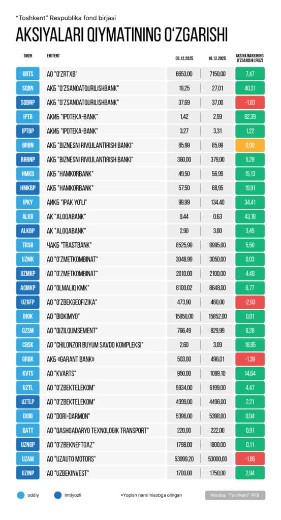 Ushbu davr mobaynida «Ipoteka-bank»ning oddiy aksiyalari eng katta o‘sishga erishib, 82,39 foizga qimmatlashdi. Shuningdek, «Aloqabank» (+43,18%) va «O‘zsanoatqurilishbank»ning oddiy (+40,31%) aksiyalarida ham o‘sish qayd etildi.