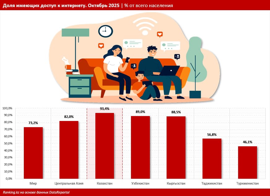 Markaziy Osiyoda internetga ulangan aholining ulushi global o‘rtacha ko‘rsatkichdan sezilarli darajada yuqori: 82 foiz. Qozog‘iston mintaqa mamlakatlari orasida eng yuqori ko‘rsatkichga ega: 93,4 foiz. Undan keyin O‘zbekiston (89 foiz), Qirg‘iziston (88,5 foiz), Tojikiston (56,8 foiz) va Turkmaniston (46,1 foiz).