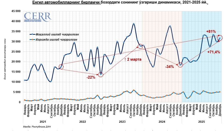 Iqtisodiy tadqiqotlar va islohotlar markazi 2025-yil yakunlari bo‘yicha O‘zbekistondagi birlamchi avtomobil bozori holati yuzasidan tahliliy sharh taqdim etdi. Unda mahalliy va import ishlab chiqarilgan yangi yengil avtomobillar savdosi, shuningdek, elektromobillar bozoridagi o‘zgarishlar aks ettirilgan.