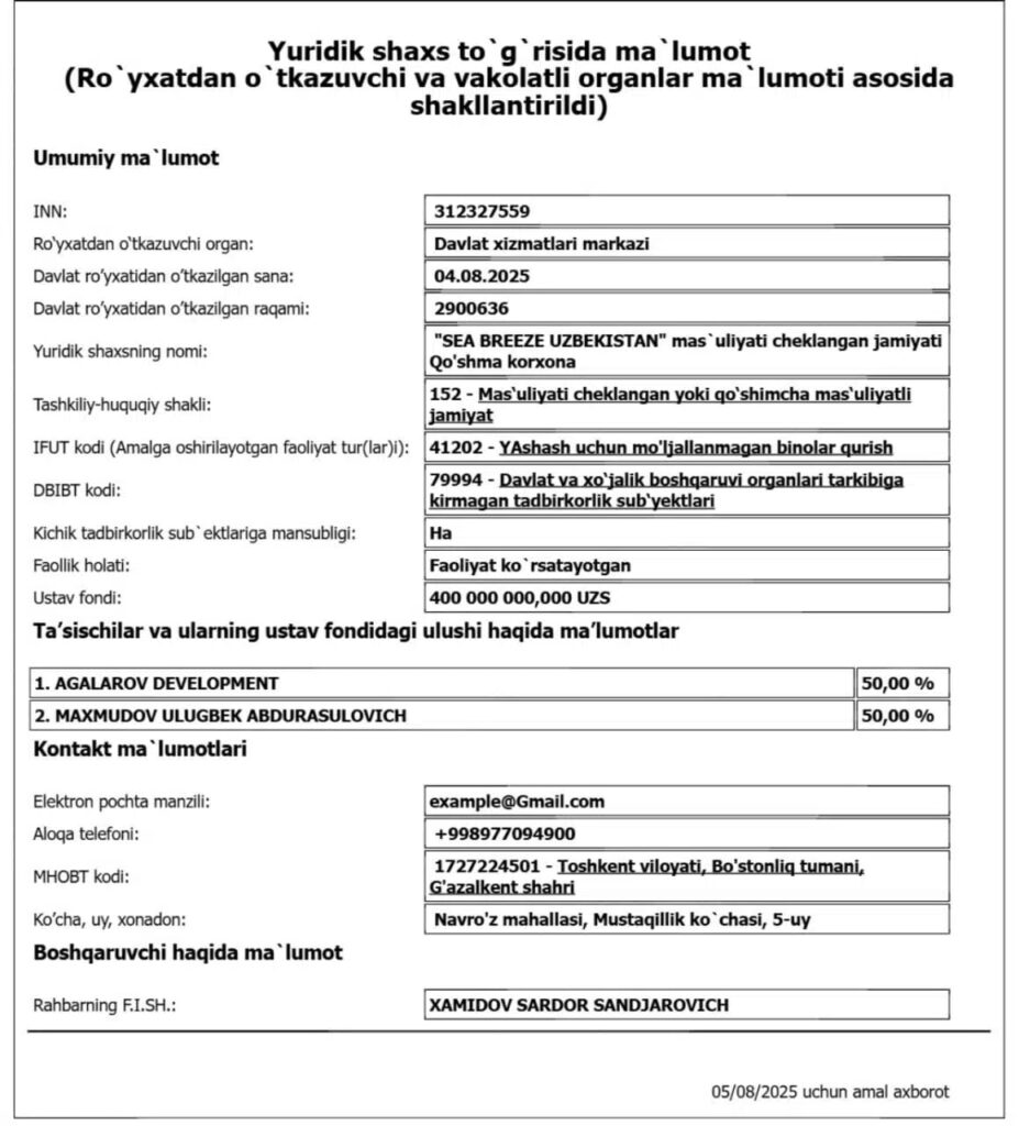 Ma’lumot uchun, Sea Breeze loyihasi 2025-yilning 4-avgust kuni O‘zbekistonda rasman ro‘yxatdan o‘tkazilgan. Ustav fondi 400 million so‘m etib belgilangan. Kompaniya ikki teng ulushli sherik – Ozarbayjonning Agalarov Development kompaniyasi va o‘zbekistonlik biznesmen Ulug‘bek Maxmudov tomonidan tashkil etilgan. Direktorlik lavozimi esa Xamidov Sardor Sandjarovichga topshirilgan.