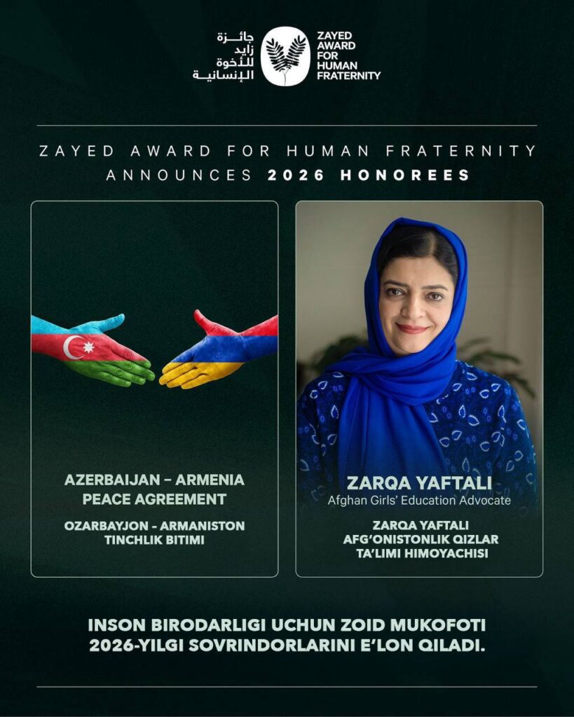 2026-yilgi Shayx Zoid nomidagi «Insoniy birodarlik» xalqaro mukofoti sovrindorlari e’lon qilindi. Prezident administratsiyasi rahbari Saida Mirziyoyeva ushbu mukofot hakamlar hay’ati a’zosi sifatida ishtirok etgani va g‘oliblarni tabriklash o‘zi uchun katta sharaf ekanini bildirdi.