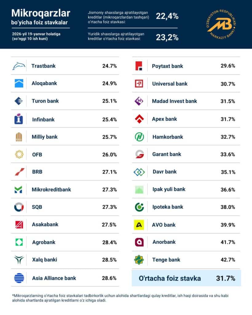 Mazkur davrda mamlakatdagi tijorat banklari tomonidan taqdim etilayotgan mikroqarzlar bo‘yicha o‘rtacha foiz stavkasi 31,7 foizni tashkil etdi. Shundan jismoniy shaxslarga ajratilayotgan kreditlarning (mikroqarzlardan tashqari) o‘rtacha foiz stavkasi 22,4 foizni, yuridik shaxslar ulushi esa 23,2 foizni ko‘rsatmoqda.