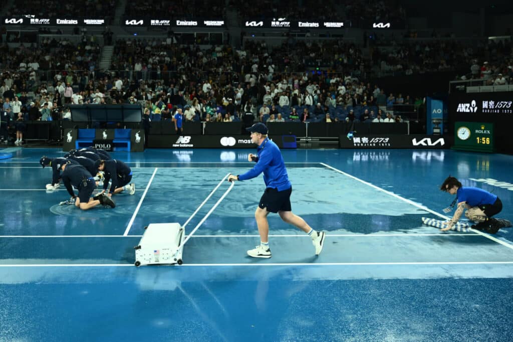 Melbourne, Avstraliya. Avstraliya ochiq chempionati doirasida erkaklar ikkinchi bosqich o‘yini davomida yomg‘ir sabab maydon nam bo‘lib qolgani tufayli xodimlar kortni quritmoqda.