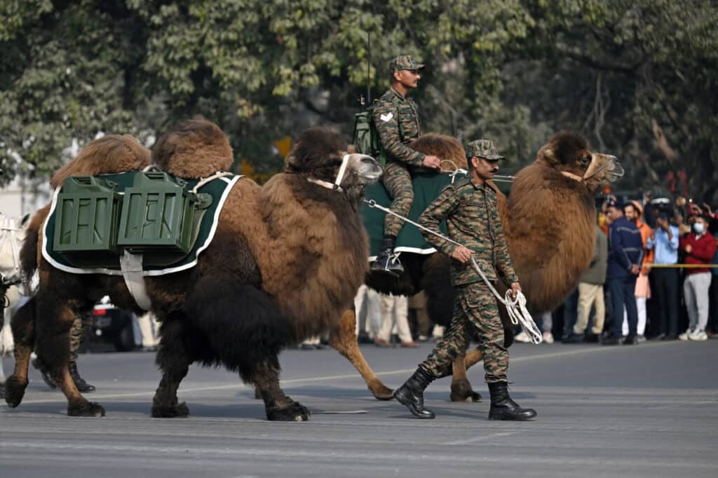 Yangi Dehli, Hindiston. Respublika kuni paradiga tayyorgarlik doirasida Remount Veterinary Corps xodimlari ikki kambali tuyalarni yuritmoqda.