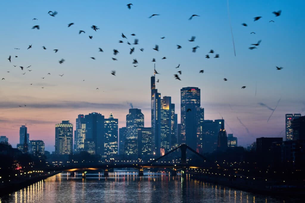 Frankfurt, Germaniya. Qushlar Main daryosi ustidan, shahar banklar hududi fonida uchmoqda.
