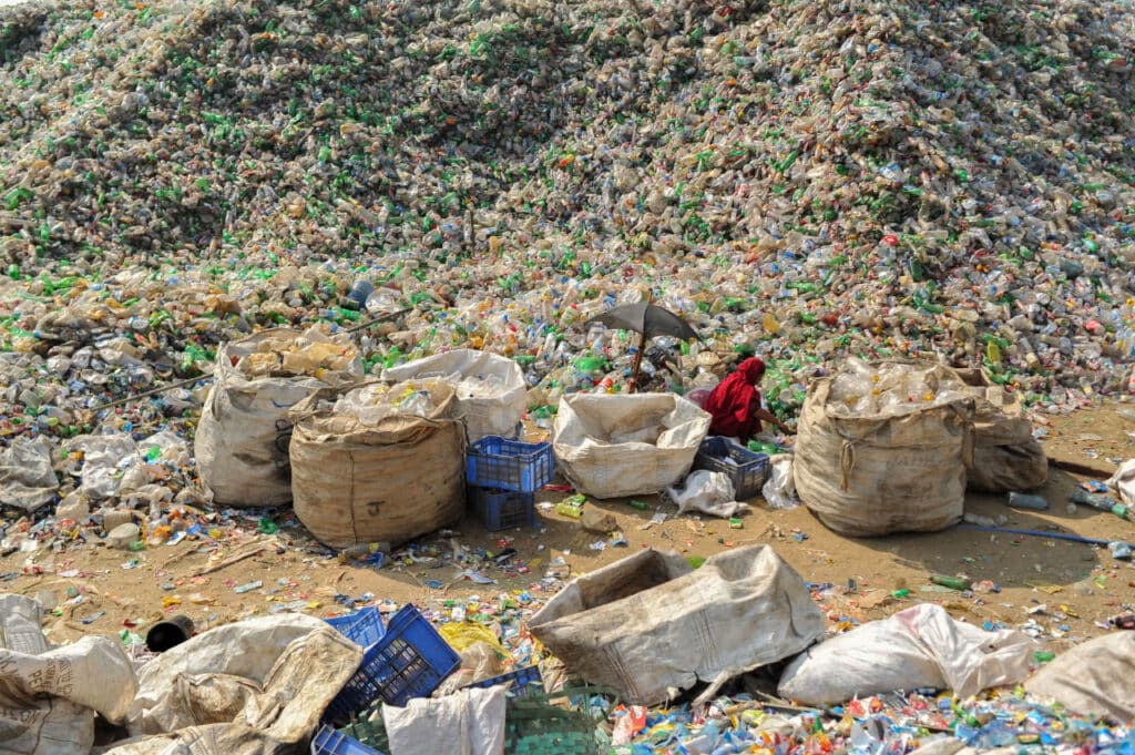 Chattogram, Bangladesh. Ishchi plastik idishlarni qayta ishlash markazidagi materiallarni saralamoqda.