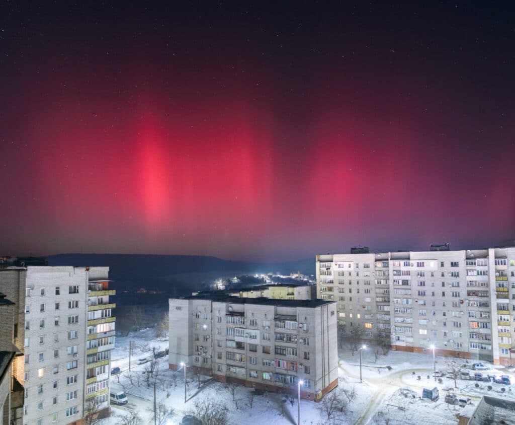 Lviv, Ukraina. Shimoliy chiroqlar (aurora borealis) G‘arbiy Ukrainaning baland uylari ustida porlamoqda.