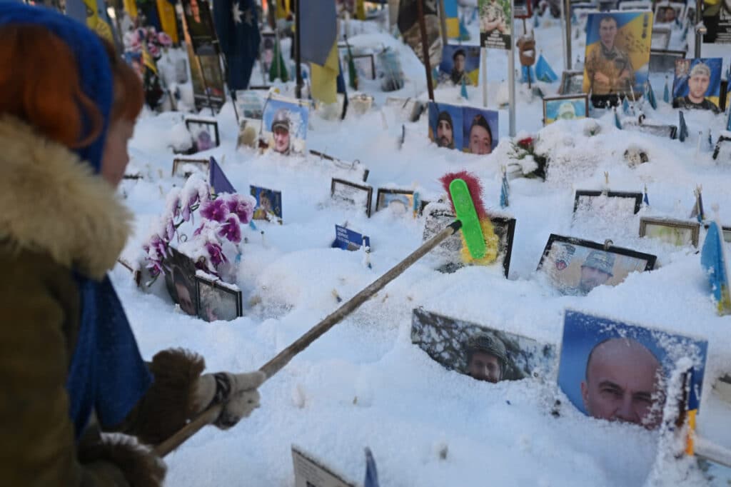 Kiyev, Ukraina. Ayol Mustaqillik maydonidagi yodgorlikda Ukraina va xorijiy jangchilar suratlaridan qorni tozalamoqda.