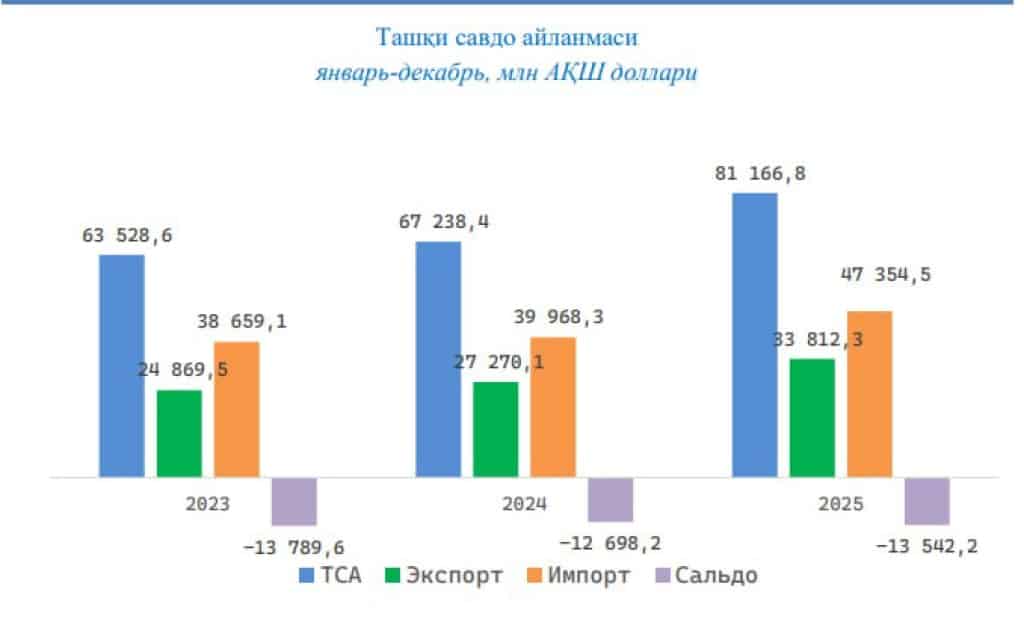 2025-yilning yanvar-dekabr oylarida respublikaning tashqi savdo aylanmasi $81,2 milliardga yetdi, bu 2024-yilga nisbatan 20,7 foizga ko‘pni tashkil qiladi. Bu haqda Milliy statistika qo‘mitasi hisobotida keltirilgan.
