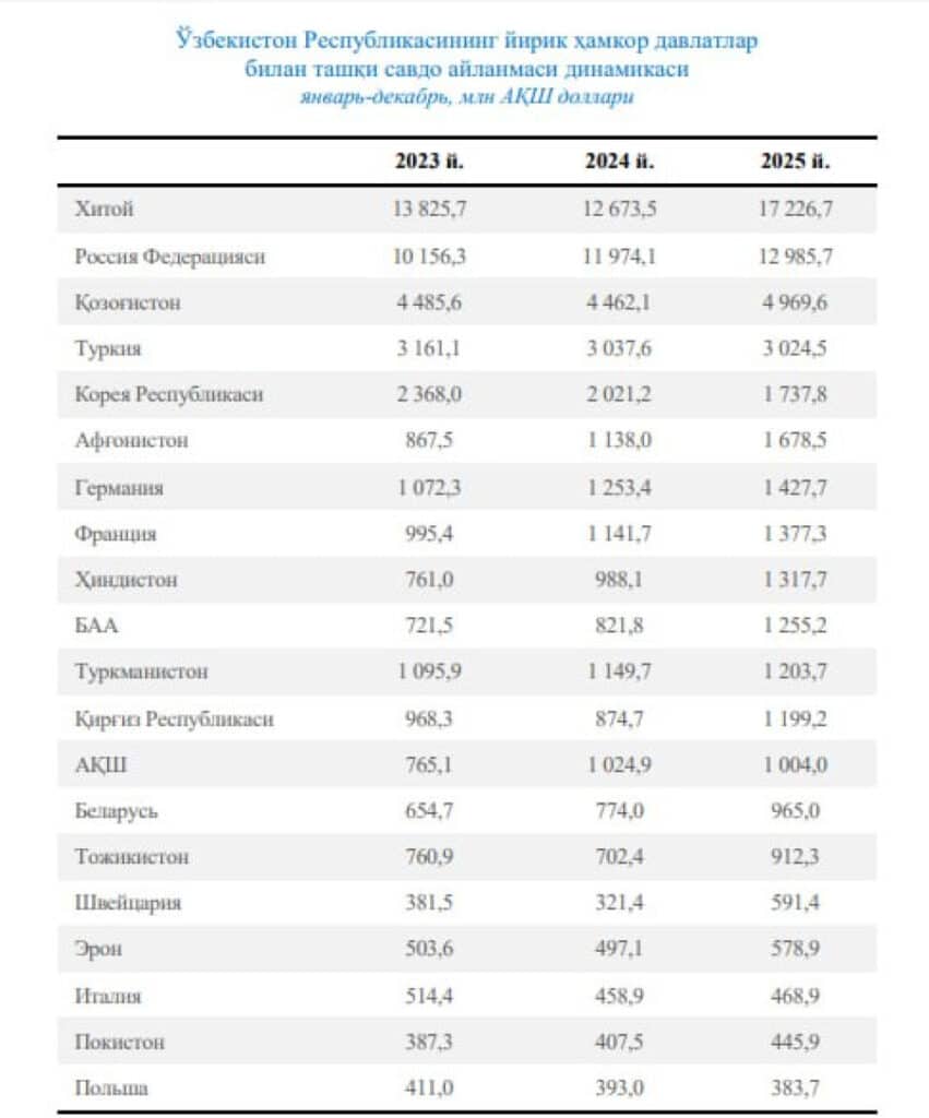 2025-yil yanvar-dekabr oylarida mamlakat 180 dan ortiq davlatdan tovar va xizmatlar importini amalga oshirdi. Yirik hamkor davlatlar, jumladan, Xitoy (31,2 foiz), Rossiya (18,3 foiz), Qozog‘iston (7,2 foiz), Turkiya (4 foiz), Janubiy Koreya (3,5 foiz), Germaniya (2,7 foiz) va Hindiston (2,4 foiz) jami importning 60 foizdan ortig‘ini tashkil etdi.