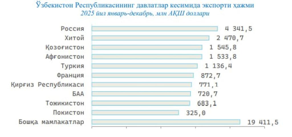 2025-yilning yanvar-dekabr oylarida tashqi savdo aylanmasida tovarlar va xizmatlar eksporti bo‘yicha asosiy hamkorlar Rossiya (12,8 foiz), Xitoy (7,3 foiz), Qozog‘iston (4,6 foiz), Afg‘oniston (4,5 foiz), Turkiya (3,4 foiz), Fransiya (2,6 foiz), Qirg‘iziston (2,3 foiz), BAA (2,1 foiz), Tojikiston (2 foiz) va Pokiston (1 foiz) kabi davlatlar bo‘ldi. Ularning umumiy eksportdagi ulushi 40 foizdan ortiqni tashkil etdi.
