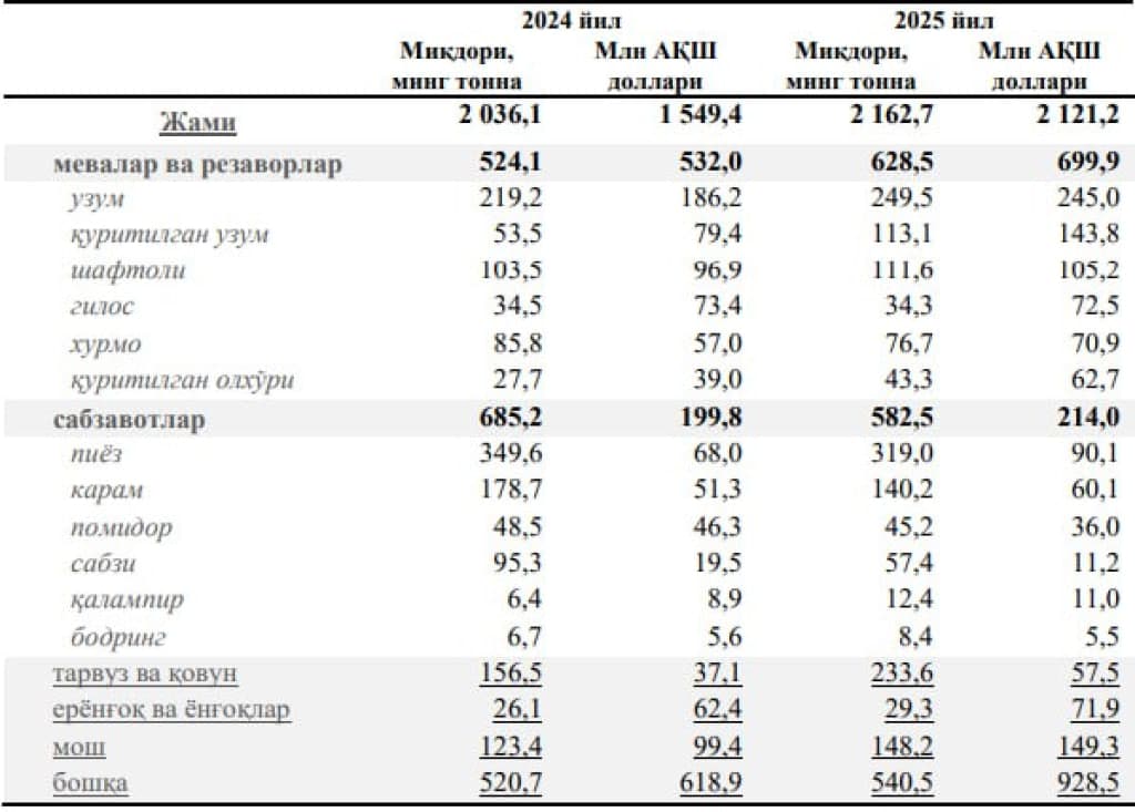 O‘tgan yili O‘zbekiston 2,16 mln tonna meva va sabzavotlar eksport qilgan, ushbu ko‘rsatkich 2024-yilga nisbatan 6,2 foiz yoki 126,6 ming tonnaga oshganini ko‘rsatmoqda. Ushbu mahsulotlar eksporti tufayli respublika balansiga $2,12 milliard tushgan, bu 36,9 foizlik o‘sish degani. Natijada meva-sabzavot mahsulotlarining jami eksportdagi ulushi 6,3 foizni tashkil qildi.