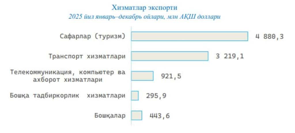 Eksportning ushbu yo‘nalishidan $9,76 milliard pul kelib tushgan. Bu jami eksport hajmining 28,9 foizini tashkil etib, 2024 yilga nisbatan 28,9 foizga o‘sish kuzatildi. Xizmatlar eksporti tarkibining asosiy ulushi safarlar (50 foiz), transport (33 foiz), telekommunikatsiya, kompyuter va axborot (9,4 foiz) va boshqa tadbirkorlik bilan bog‘liq xizmatlar (3 foiz) hissasiga to‘g‘ri kelgan.