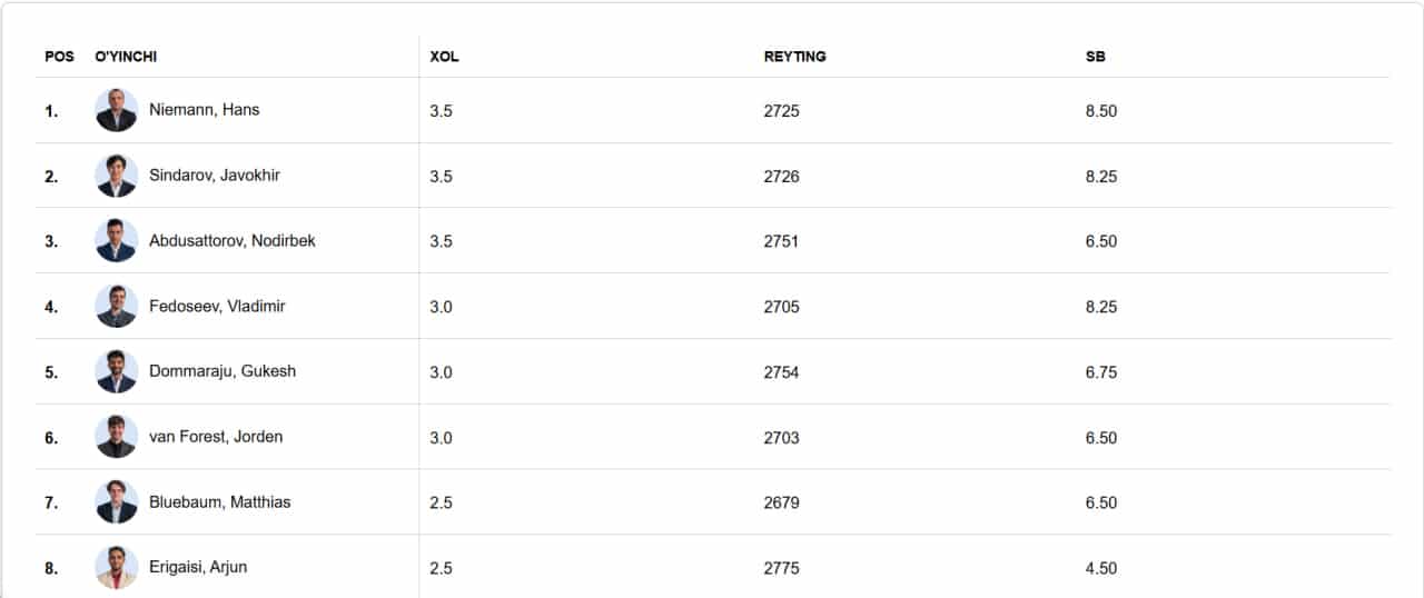 Musobaqa jadvalidagi vaziyat quyidagicha. Hozirda 3,5 ochko to‘plagan Hans Niemann qo‘shimcha ko‘rsatkichlar evaziga peshqadamlikni saqlab turibdi. Javohir Sindorov va Nodirbek Abdusattorov uni ta’qib qilmoqda. Eslatib o‘tamiz, Javohir avvalgi turlarda amaldagi jahon chempioni Gukesh Dommaraju va niderlandiyalik Anish Giri bilan durang o‘ynagan, 4-turda esa germaniyalik raqibini mag‘lub etgandi.
