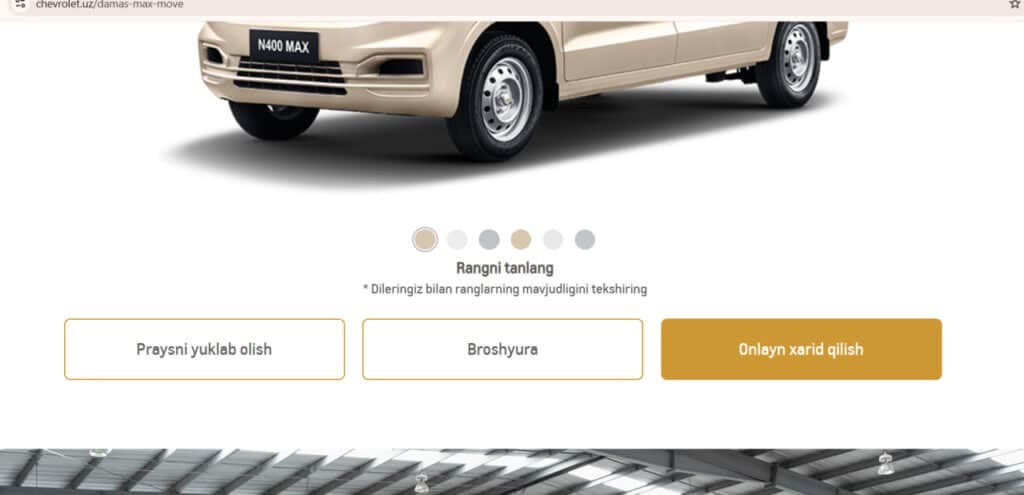 Modelning xususiyatlari va narxlari chevrolet.uz saytiga joylashtirilgan bilan avtomobilni uzavtosavdo.uz saytida onlayn xarid qilish qilish imkoni hozircha mavjud emas. Savdo platformasida faqat Damas’ning oldingi versiyalari va boshqa modellarni ko‘rish mumkin.