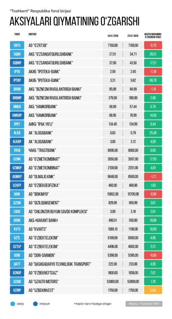 «Toshkent» respublika fond birjasi (RFB)dan joy olgan yuqori likvidli aksiyalarning aksariyati 16-yanvardan 23-yanvargacha bo‘lgan davrda ijobiy dinamikani ko‘rsatib, UCI fond indeksi 1,01 foizga oshdi.