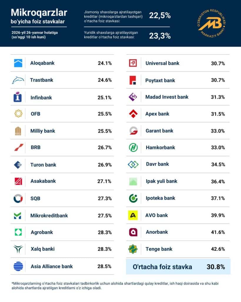 Avvalroq Kursiv Uzbekistan 19-yanvar holatiga ko‘ra, tijorat banklarida amal qilayotgan mikroqarz va avtokreditlarning so‘nggi 10 ish kuni bo‘yicha foiz stavkalari e’lon qilingani haqida yozgandi.