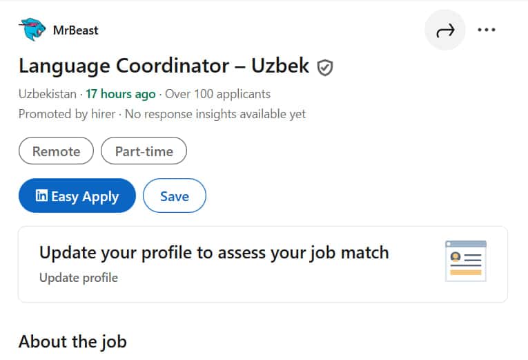 Dunyoning mashhur YouTube blogeri MrBeast (Jimmy Donaldson) LinkedIn tarmog‘ida Language Coordinator – Uzbek lavozimiga vakansiya ochdi. Tanlangan mutaxassis kontentni o‘zbek tiliga o‘girish, dublyaj va subtitrlash jarayonlarini muvofiqlashtirishi lozim.