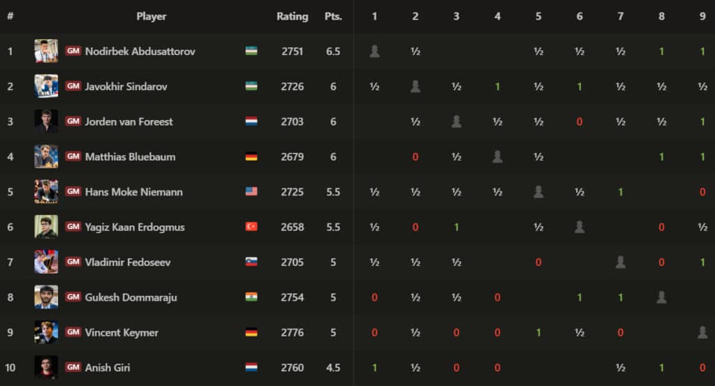 29-yanvar kungi bahslardan so‘ng, Abdusattorov 6,5 ochko bilan musobaqa jadvalida yakka peshqadamlik qilmoqda. Javohir Sindorov esa peshqadamdan yarim ochko ortda qolgan holda, 6 ochko bilan ikkinchi o‘rinni band etgan.