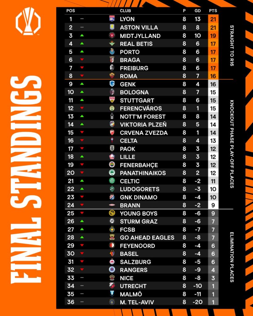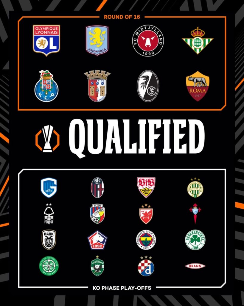 Liga bosqichi yakunlariga ko‘ra, «Lion», «Aston Villa», «Midtyulland», «Portu», «Real Betis», «Braga», «Frayburg» va «Roma» klublari to‘g‘ridan to‘g‘ri 1/8 final yo‘llanmasini qo‘lga kiritdi. 9-o‘rindan 24-o‘ringacha bo‘lgan jamoalar, jumladan «Genk», «Bolonya», «Shtutgart», «Ferensvarosh» va «Nottingem Forest» kabi klublar 1/8 finalga chiqish uchun o‘tish o‘yinlarida ishtirok etadi.