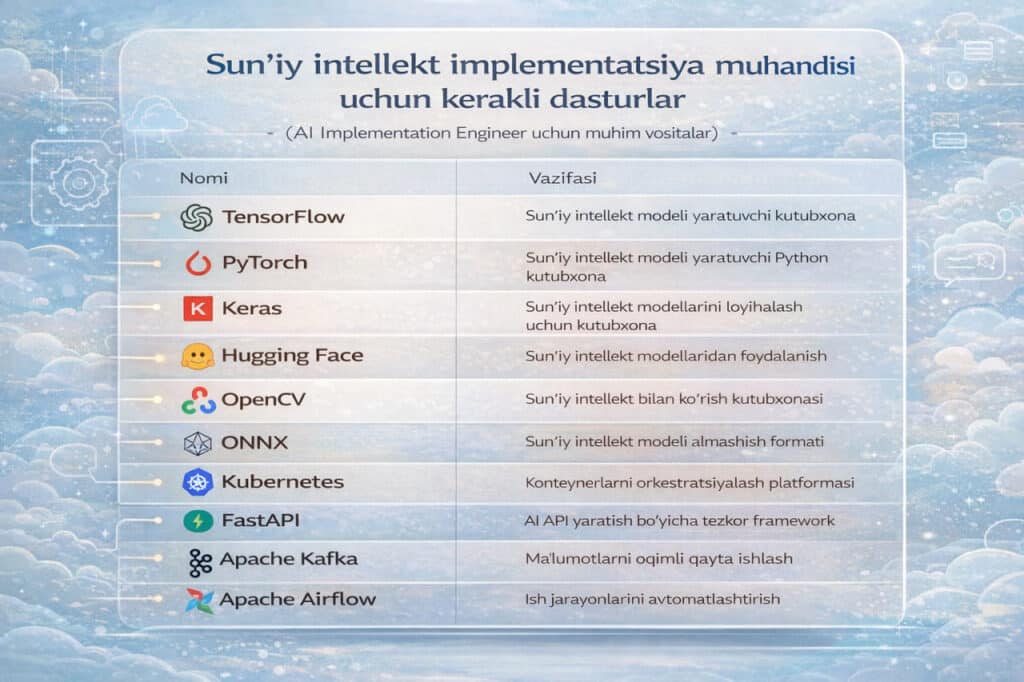 SI implementatsiya muhandisi ishlab chiqilgan sun’iy intellekt yechimlarini korxonalarga samarali joriy etadi va ularning barqaror ishlashini ta’minlaydi. U tizimlarni real muhitga joylashtiradi, optimallashtiradi hamda texnik qo‘llab-quvvatlashni amalga oshiradi.