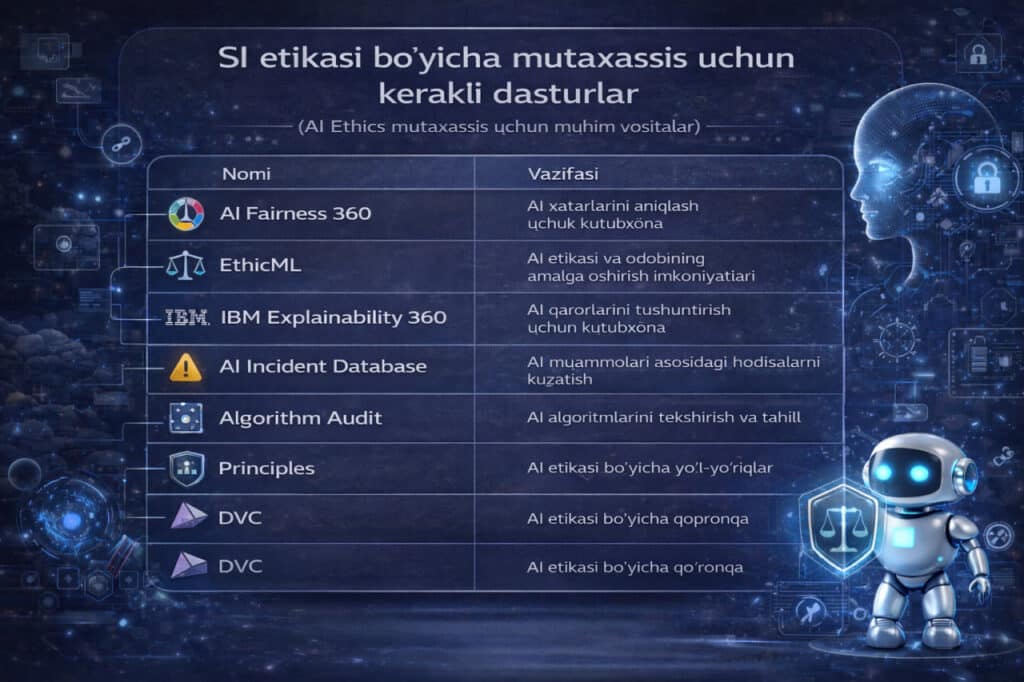 Yana bir talabgir kasb — SI etikasi mutaxassisi sun’iy intellekt tizimlarining axloqiy va yuridik jihatlarini boshqaradi hamda ularning qonunlarga mos ishlashini ta’minlaydi. Ushbu kasbni o‘rganish odatda 1–1,5 yilni tashkil etadi. Kerakli ko‘nikmalar qatoriga etik normalar, ma’lumotlar huquqi va normativ hujjatlar bilan ishlash kiradi.
