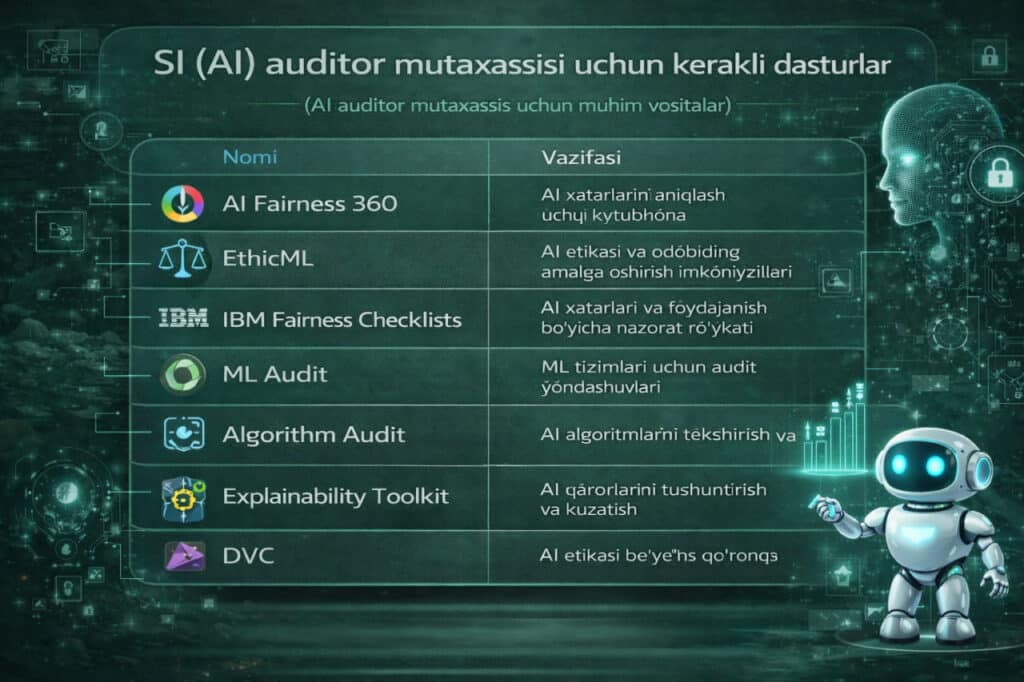 Bugungi kunda SI auditorlarga talab yuqori. Ular tizim xavfsizligi va ma’lumotlar maxfiyligini nazorat qiluvchi mutaxassis hisoblanadi. Ushbu kasbni o‘rganish odatda 1,5–3 yil davom etadi. Zarur ko‘nikmalar qatoriga kiberxavfsizlik asoslari va SI modellarining xavfsizligini baholash kiradi.