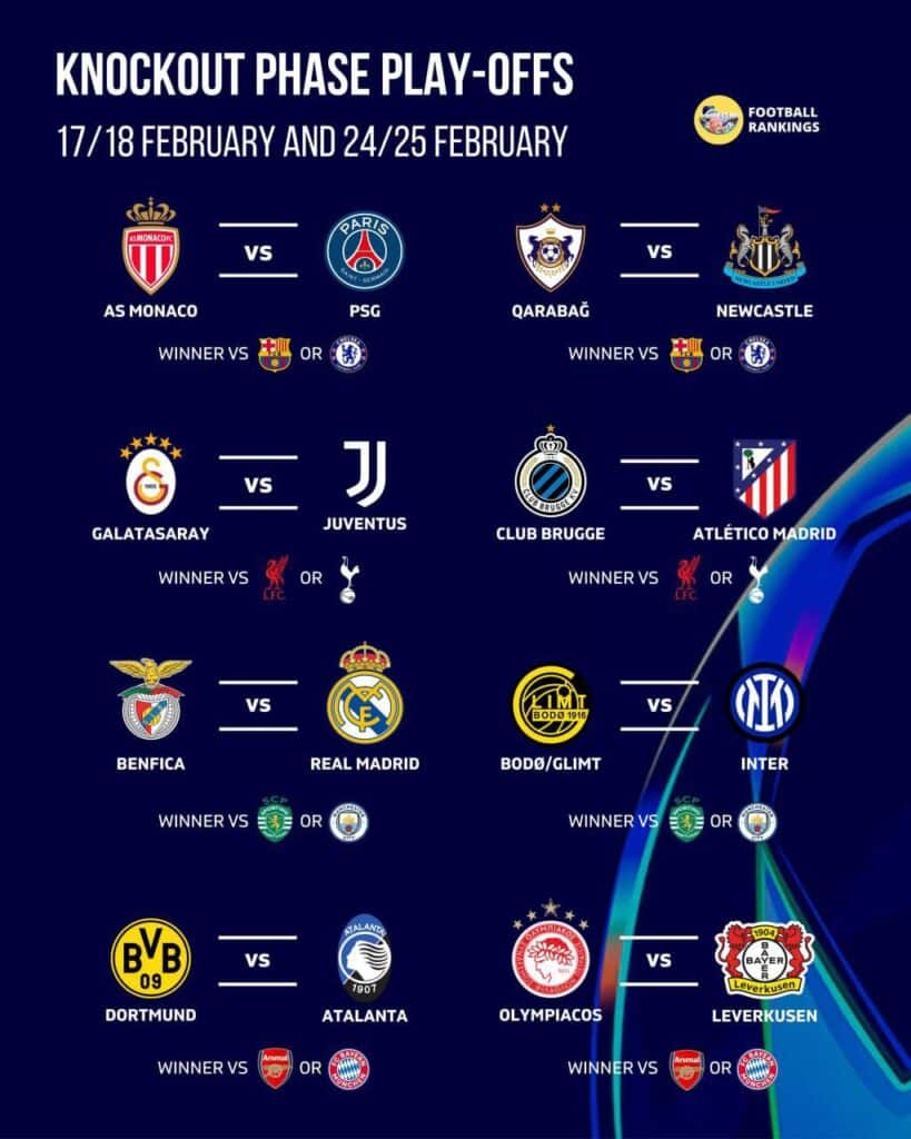 O‘tish bosqichidagi boshqa juftliklar quyidagicha ko‘rinish oldi. Ozarbayjonning «Qorabog‘» klubi Angliyaning «Nyukasl Yunayted» jamoasi bilan, Belgiyaning «Bryugge» klubi Ispaniyaning «Atletiko Madrid» jamoasi bilan to‘qnash keladi. Shuningdek, «Bodo Glimt» — «Inter» hamda «Olimpiakos» — «Bayer Leverkuzen» bahslari o‘tkaziladi.