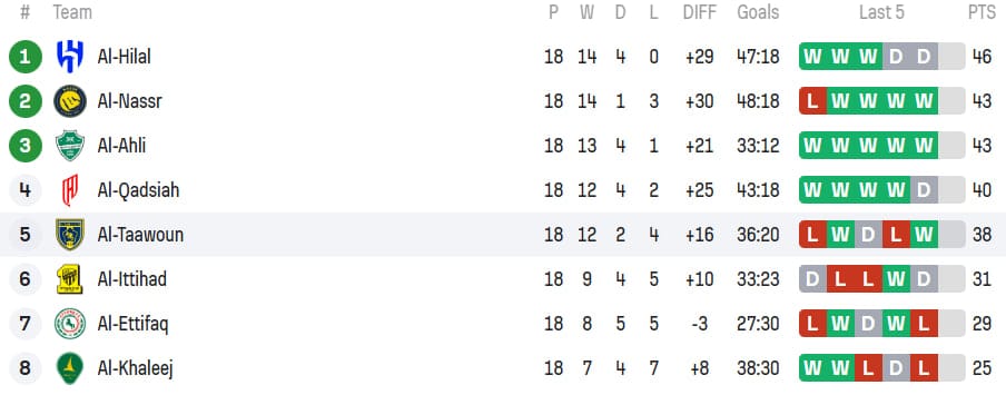 Chempionlik uchun kurashayotgan «Al-Nassr» ushbu g‘alabadan keyin 43 ochko bilan turnir jadvalining ikkinchi pog‘onasini egallab turibdi. Peshqadam «Al-Hilol»dan 3 ochko ortda qolayotgan Xorxe Jezus shogirdlari uchun har bir o‘yin finalga teng. «Al-Xolud» esa ligada jon saqlab qolish uchun kurashmoqda va ayni damda 15 ochko bilan 14-o‘rinni band etgan.