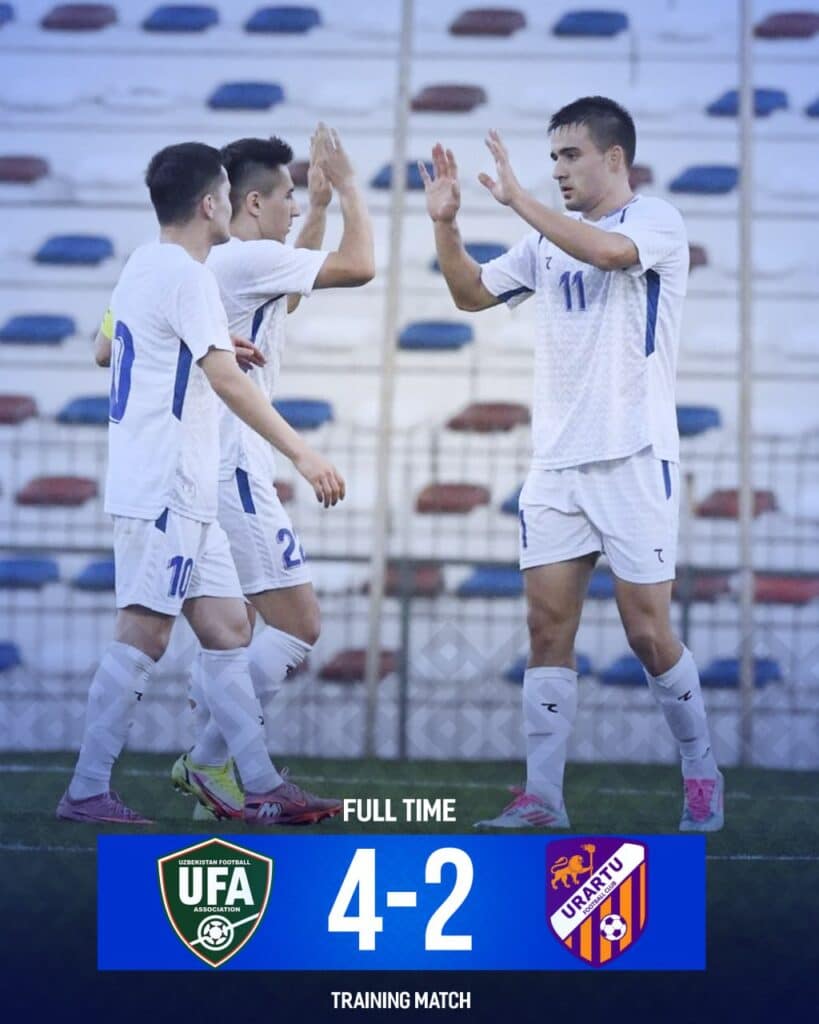 O‘zbekiston milliy terma jamoasi Armanistonning «Urartu» klubiga qarshi o‘tkazilgan mashg‘ulot uchrashuvida 4:2 hisobida g‘alaba qozondi. Bu haqda O‘FA xabar bermoqda.