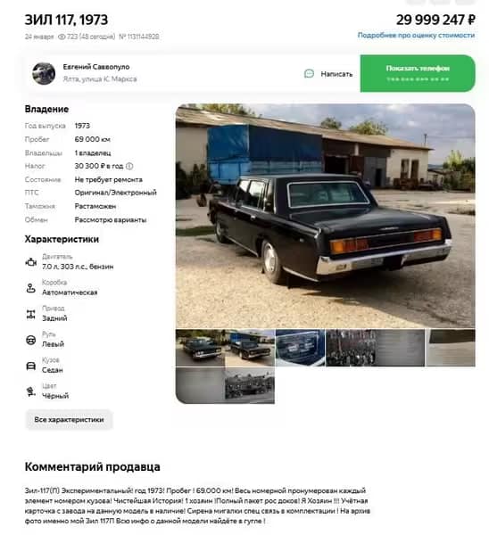 Auto.ru saytida 1973-yilda ishlab chiqarilgan ZIL-117P hukumat limuzini sotuvga chiqarildi. Ma’lumotlarga ko‘ra, «P» indeksiga ega ZIL-117 faqat bitta nusxada ishlab chiqarilgan.