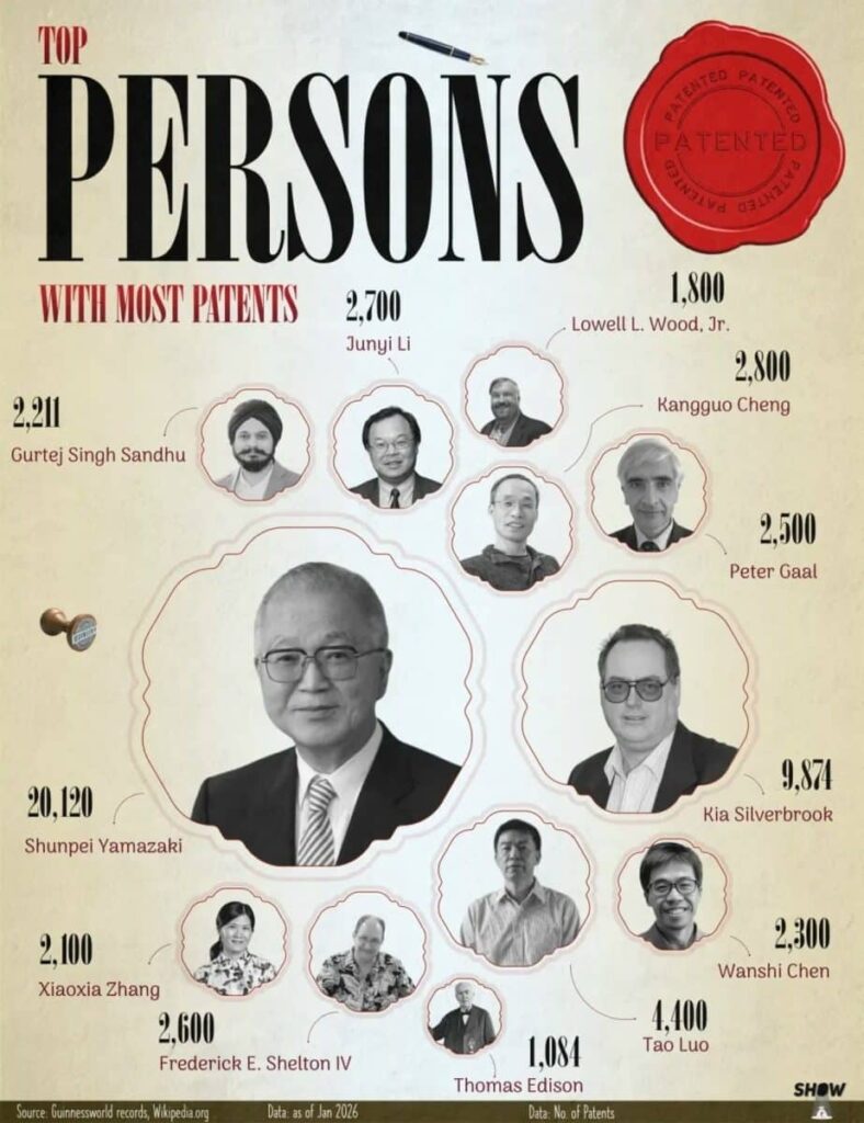 Infografika mualliflari Vikipediya va Ginnesning rekordlar kitobi ma’lumotlaridan foydalanganlar. Ixtirochilarning patentlari soni tasniflash usullariga qarab farq qilishi va vaqt o‘tishi bilan o‘zgarishi mumkin.