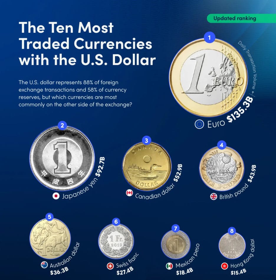 Yaponiya iyenasi kuniga $92,7 milliard bilan ikkinchi o‘rinda, Kanada dollari esa $52,9 milliard bilan kuchli uchlikni yakunlaydi. Ushbu uchta valyuta jahon bozorida dollar savdosining asosiy ulushini tashkil qiladi.