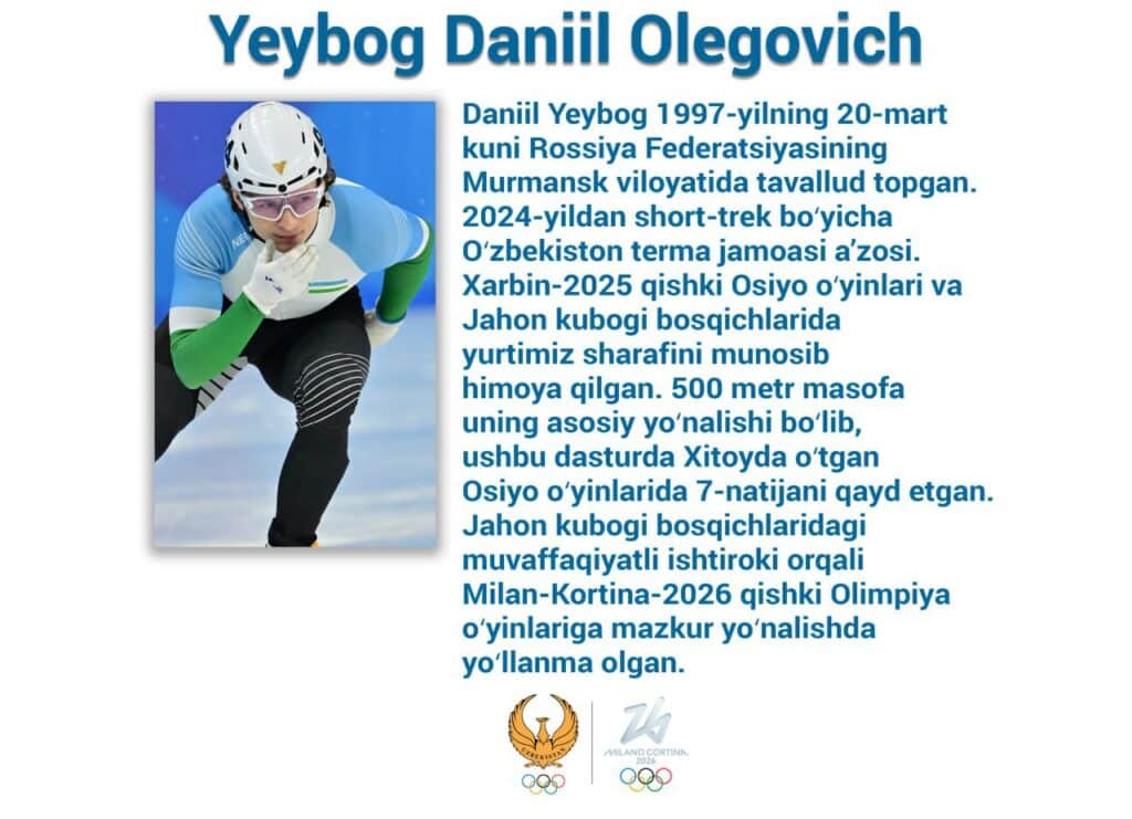 Saralash musobaqalari yakuniga ko‘ra, o‘zbekistonlik sportchilar figurali uchish, tog‘ chang‘isi va short-trek yo‘nalishlarida Olimpiada talablarini bajargan edi. Italiyaga boradigan tarkibda 2004-yilda tug‘ilgan Medet Nazarov (tog‘ chang‘isi) va tajribali Danil Yeybog (short-trek) bor. Nazarov slalom va gigant-slalomda qatnashsa, Yeybog 500 metr masofada bellashadi.