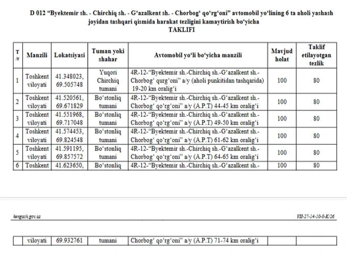 Avvalroq Kursiv Uzbekistan Toshkent viloyatida avtomobillar tezligi 100 km/soatdan 80 km/soatga tushirilishi haqida yozgandi.