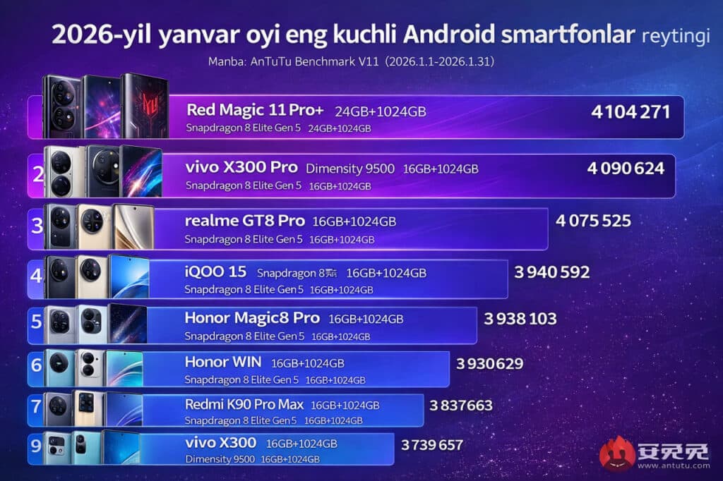 AnTuTu 2026-yil yanvar oyidagi eng kuchli smartfonlar reytingini e’lon qildi. Reyting yuqori ishlash ko‘rsatkichlariga ega qurilmalarni namoyish etadi.